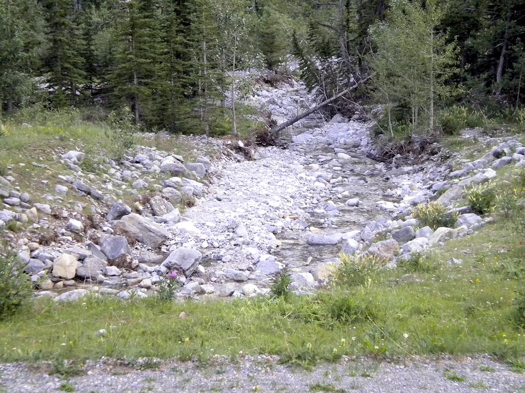 Moose Dome Creek flows through a culvert under Canyon Creek Road on its way to joining Canyon Creek about 0.2 km further west. A path leading to Campsite #1 is down an embankment to the left of this photo.