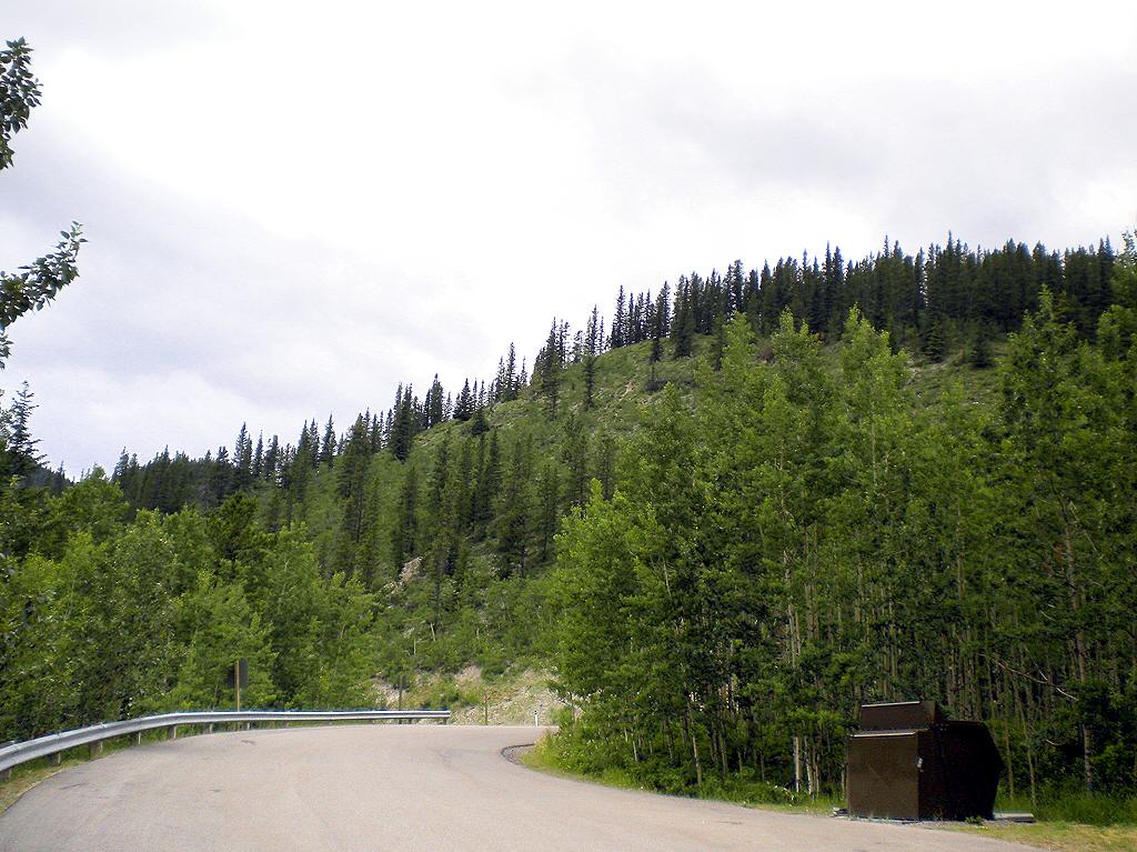Looking back towards Hwy 66 from the Elbow Falls parking area. A narrow path begins along the north side of the highway, west of the entrance, and follows the distant ridge line. For sweeping views of this part of the Elbow River, and “Sweet Life” Riverside, follow the path and hike to the top of the ridge. |