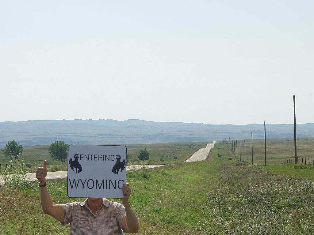 Note that in the movie, the “Entering Wyoming” sign was positioned so as to block bright spots caused by sunlight reflecting off roofs of buildings below the distant ridge line; also two power poles left of the highway. |