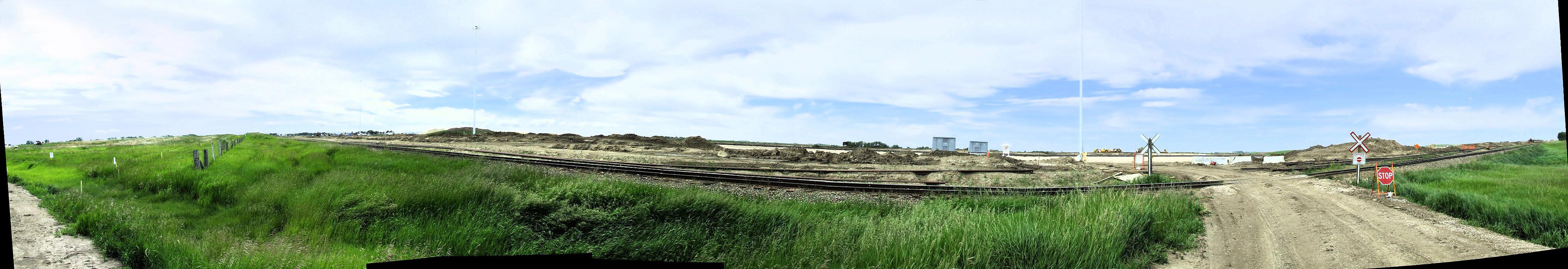 The Canadian National Raidroad (CN), is building an “Intermodal Transportation Center” (rail-to-truck freight center) here. There is extensive construction activity in all directions. The dirt road is to be replaced with paving six lanes wide. |