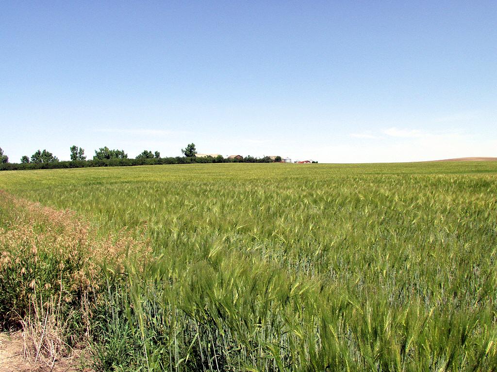 The Twist Ranch, as seen from Range Road 252. The house roof is visible left of center next to the tall tree.