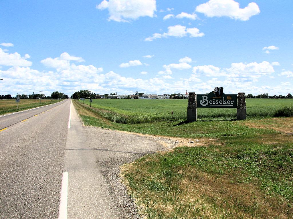 Entering Beiseker on Hwy 72 eastbound. The location of Ennis’s trailer is along the distant tree line, right of the Beiseker sign. In 2009, a new housing development was being built on the far side of the field beyond the sign.  |