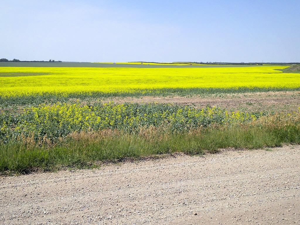 Looking northwest, across a field of canola, Hwy 72 and the Beiseker sign in the distance.