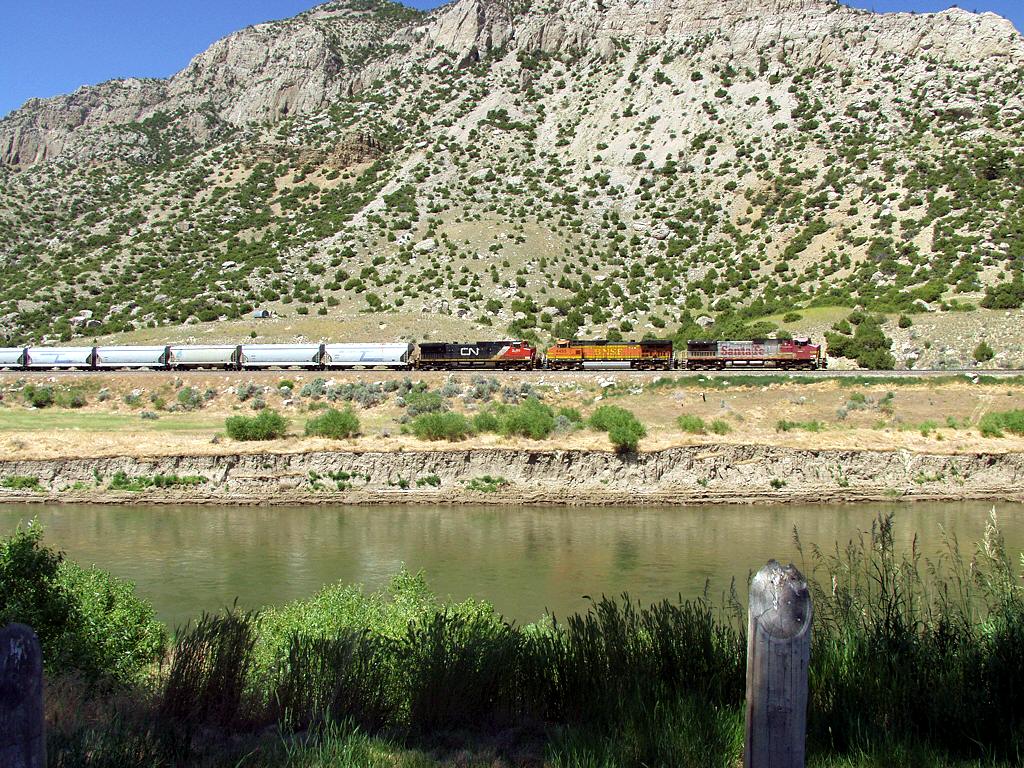 Going to Thermopolis: Boysen State Park off US-20 / WY-789. Rail fans will be interested to know that trains pass through the Wind River Canyon with some frequency. It is possible to follow a train through the canyon, stopping for photos at turnouts along the way as it passes by. |